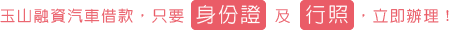 A:若您的車子已向銀行辦理車貸,遇到急用時,此時可以向玉山融資申請車貸,不過要注意的是坊間有許多小廣告,其實都是非法地下錢莊,在您緊急又不知情的狀況之下,就可能落入其陷阱,所以切記!需要融資,請找政府立案、合法經營的玉山融資公司,才能讓您借的安全又放心!
